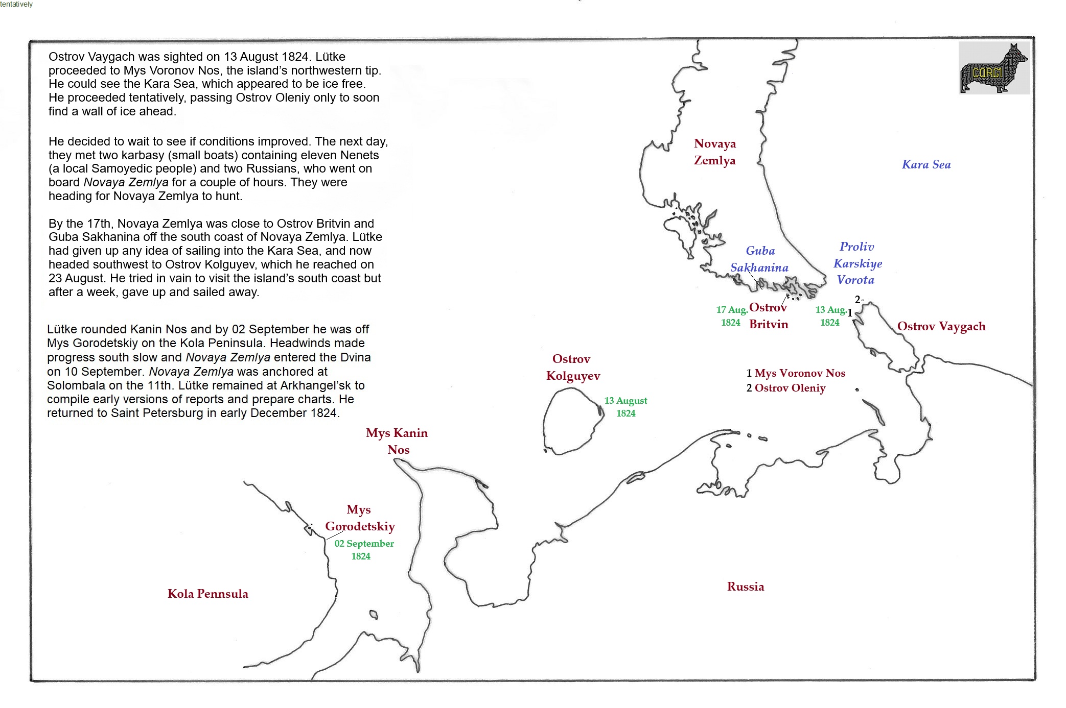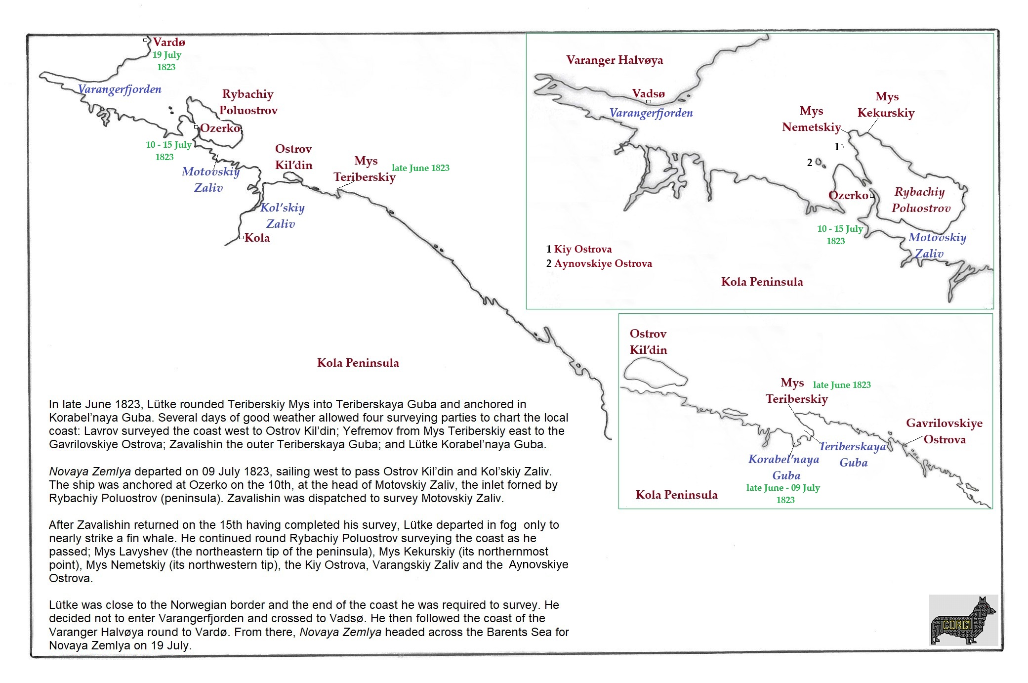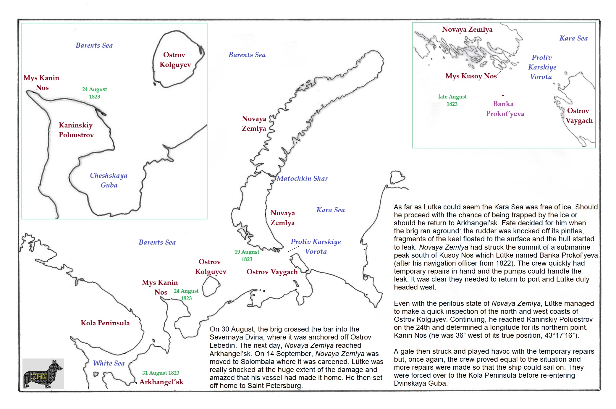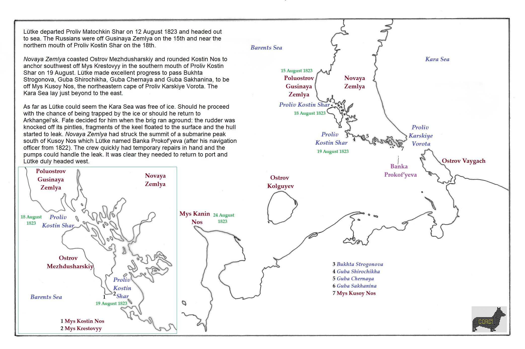 a: Southern Novaya Zemlya to Mys Kanin Nos; b: Ostrov Mezhdusharskiy and Proliv Kostin Shar