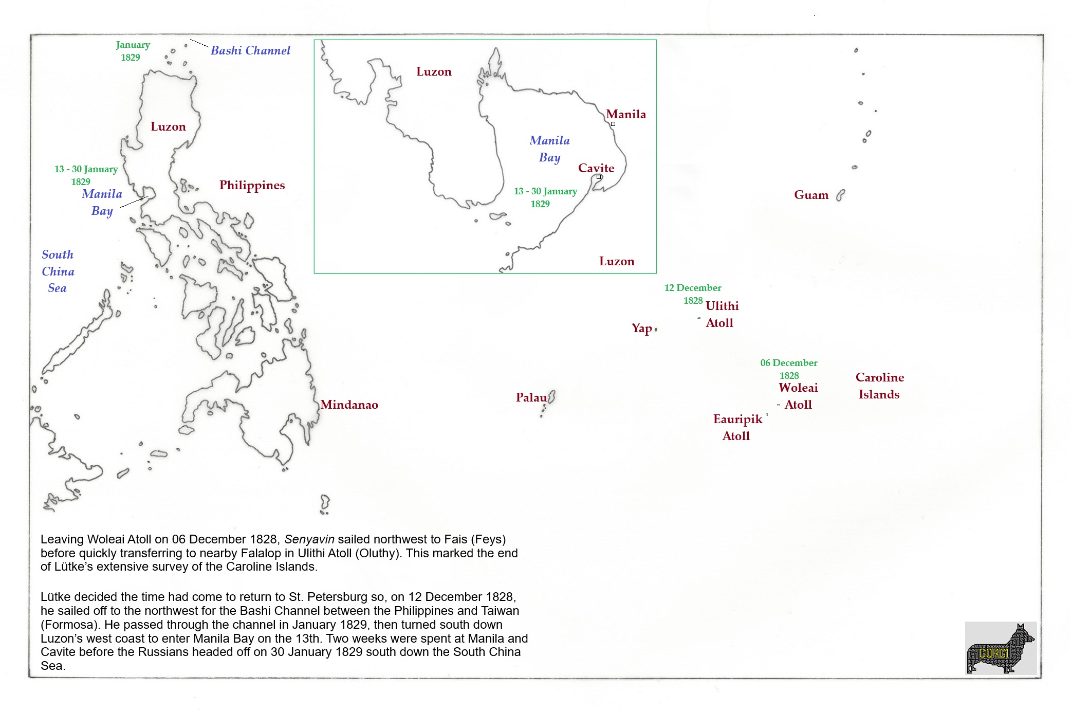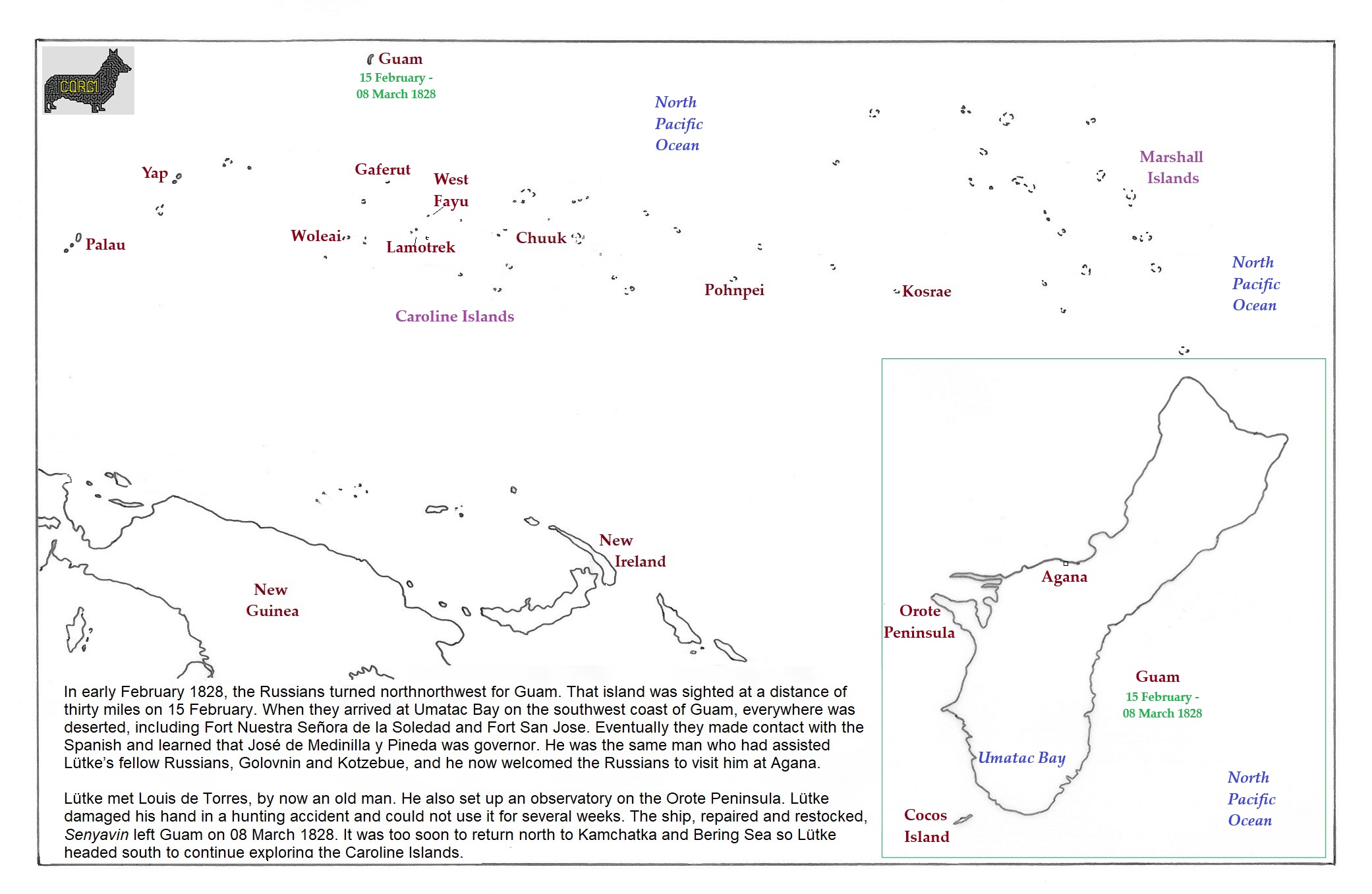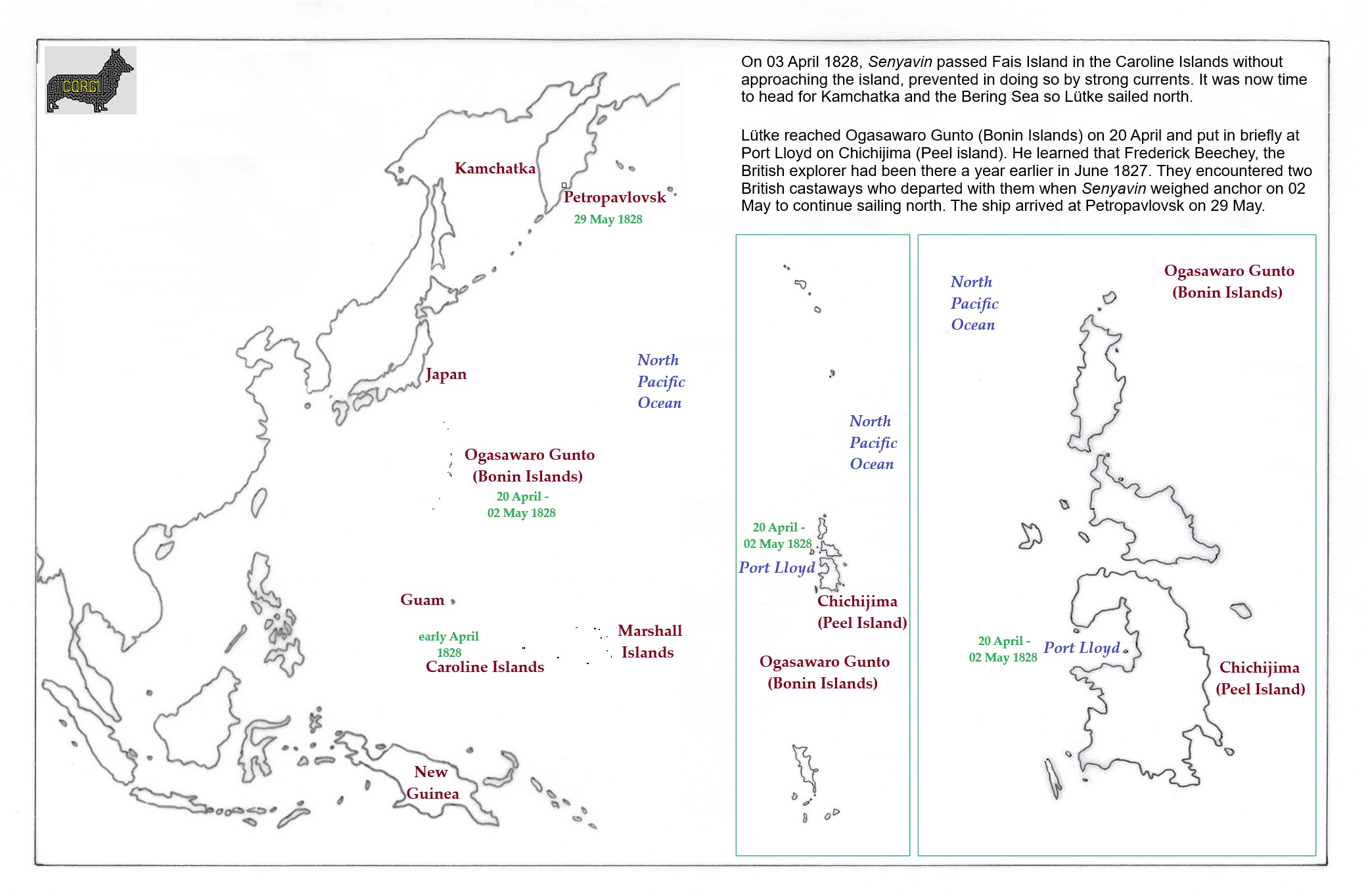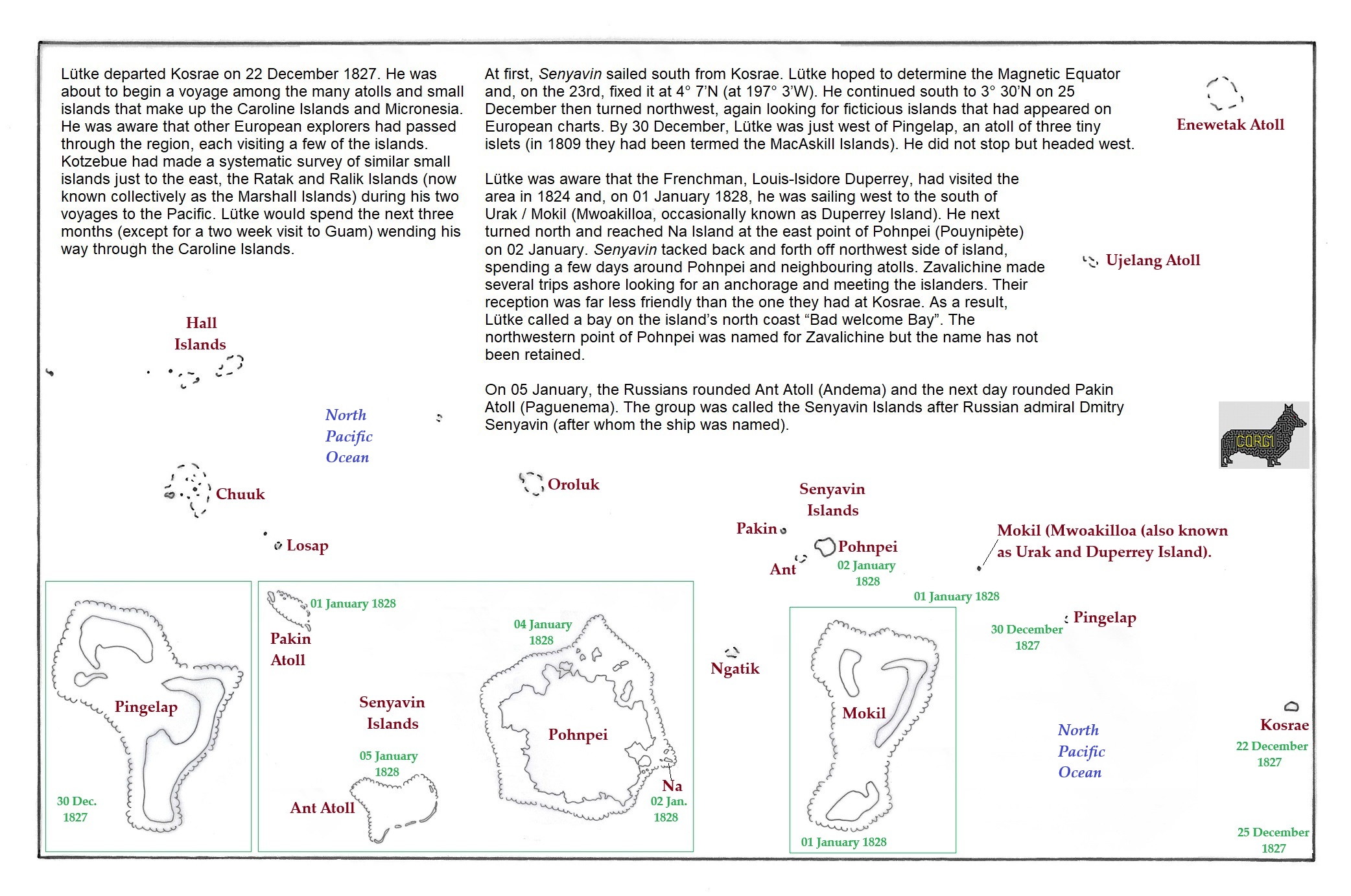 a: Petropavlovsk to Kosrae; b: Enewetak Atoll; c: Kosrae and Marshall Islands