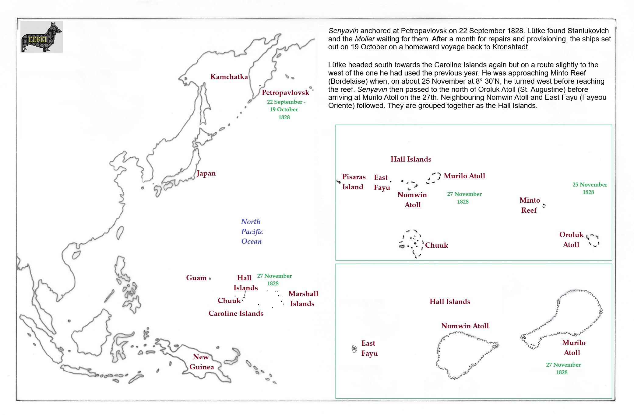 a: Petropavlovsk to Caroline Islands; b: Northeast Caroline Islands; c: Hall Islands