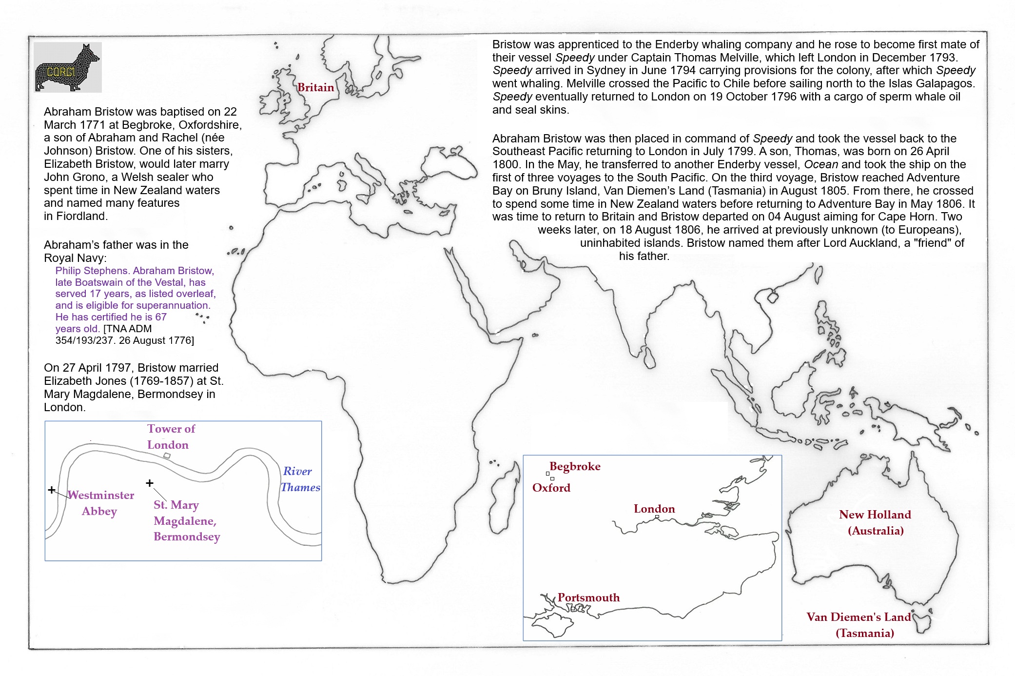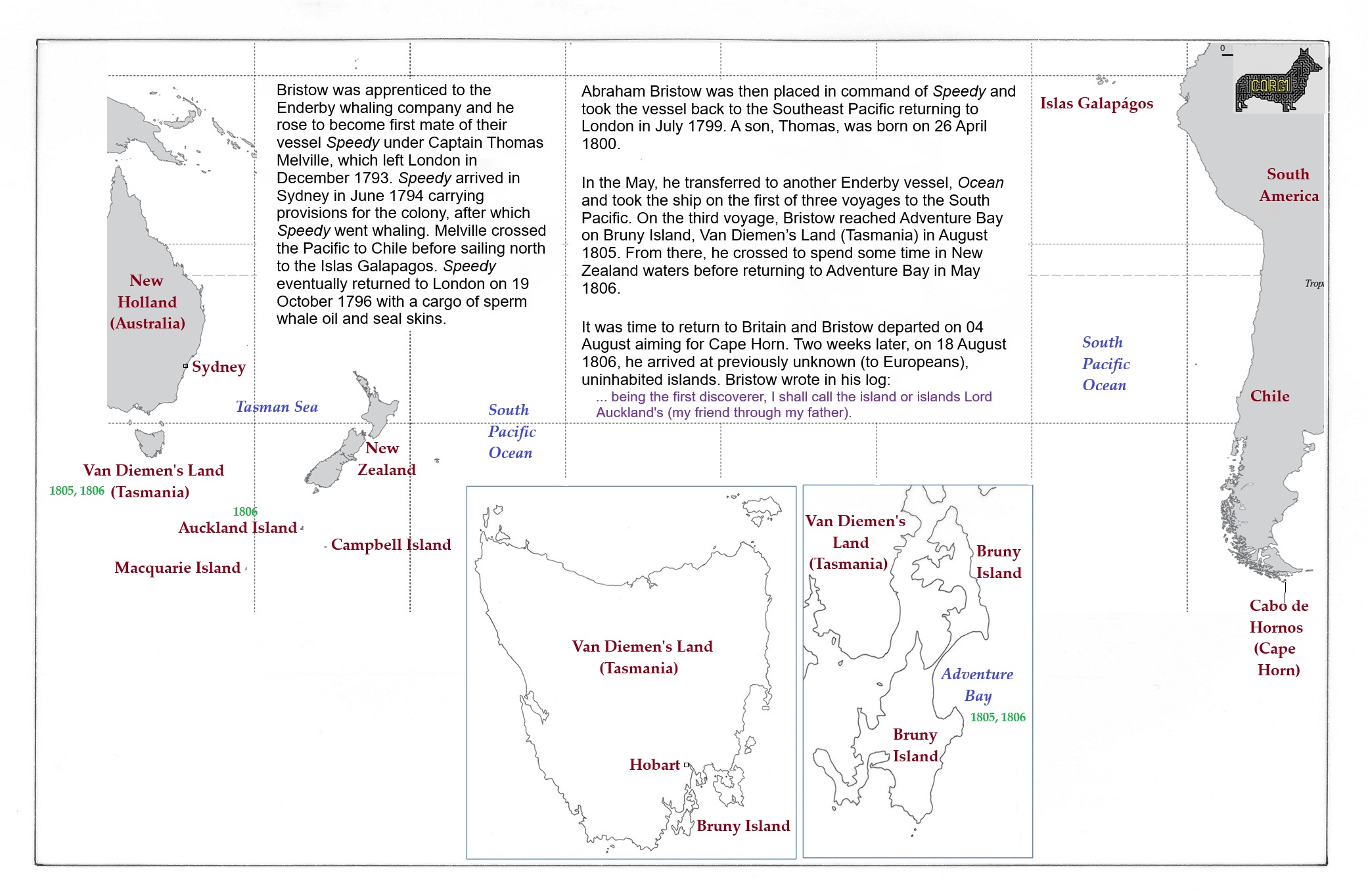 Abraham Bristow 2: a: South Pacific Ocean; b: Van Diemen’s Land (Tasmania); c: Bruny Island