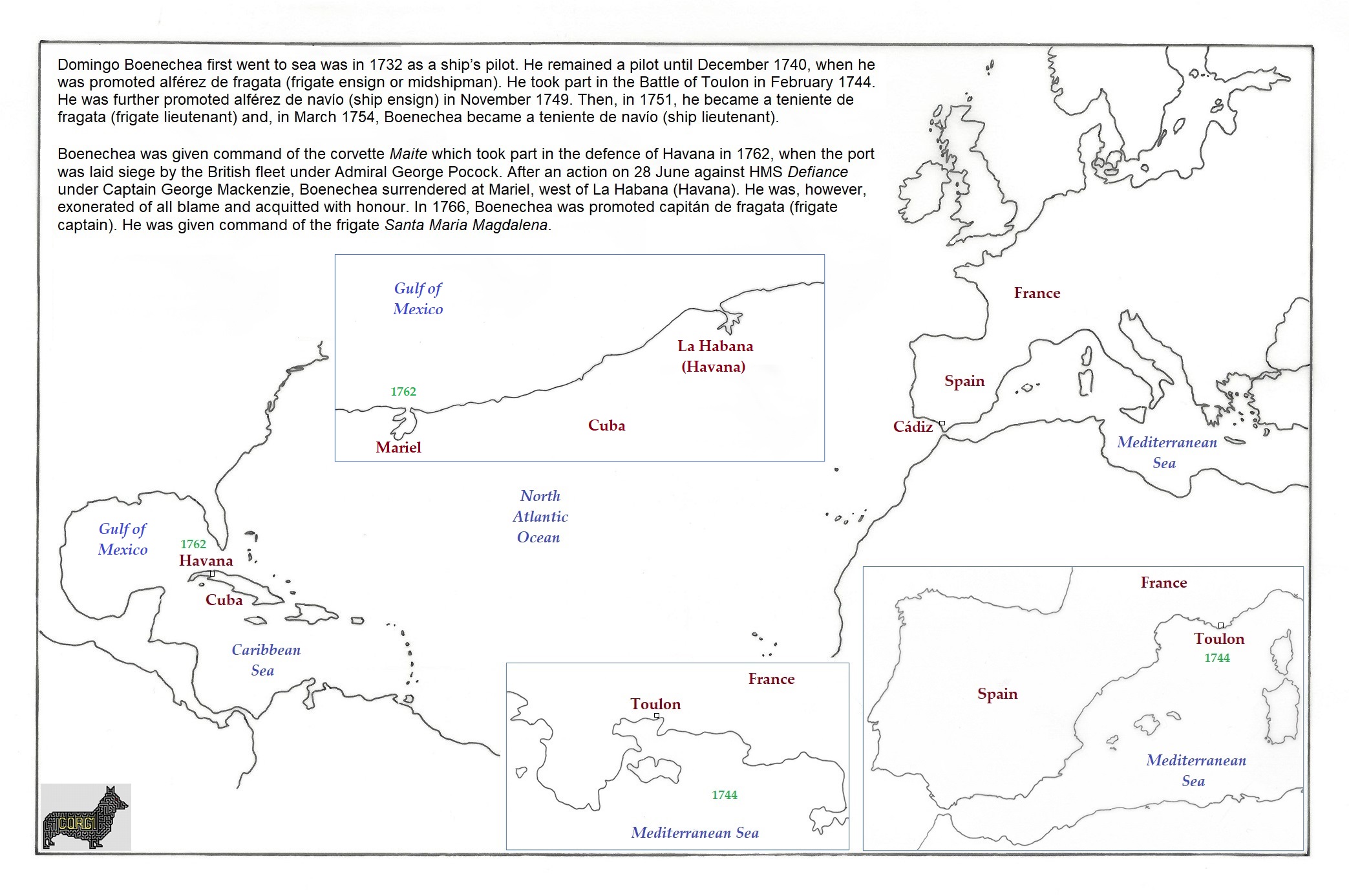 a: North Atlantic Ocean; b: Western Mediterranean; c: Toulon; d: Western Cuba