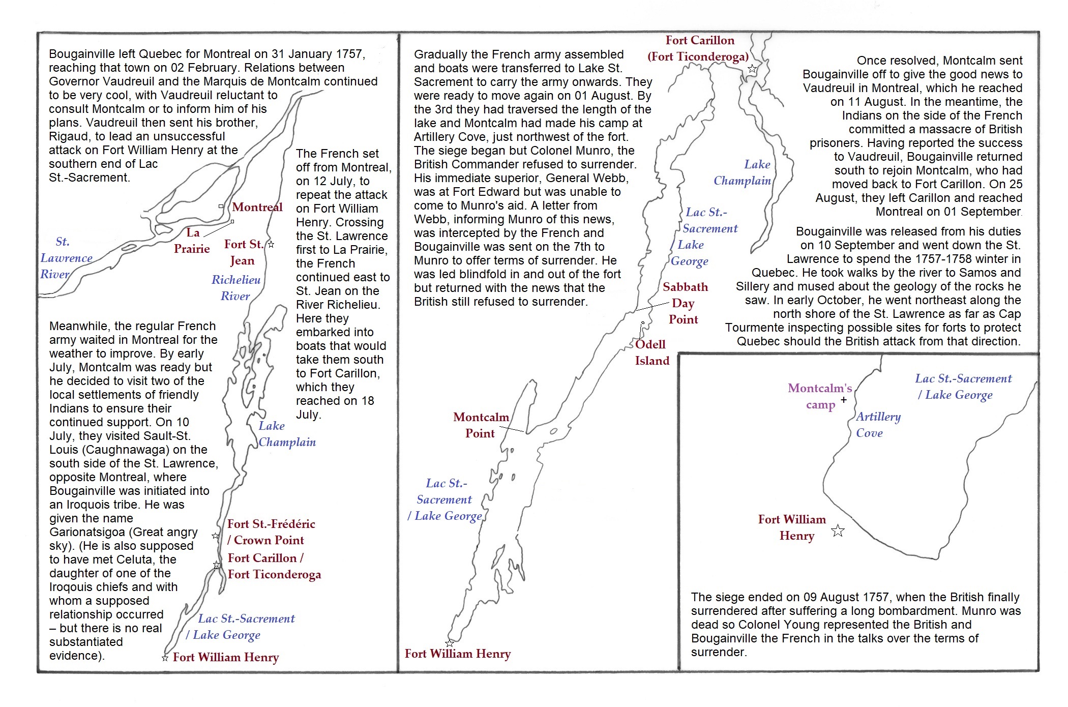 a: Fort William Henry; b: River Richelieu; c: Lake St. Sacrament