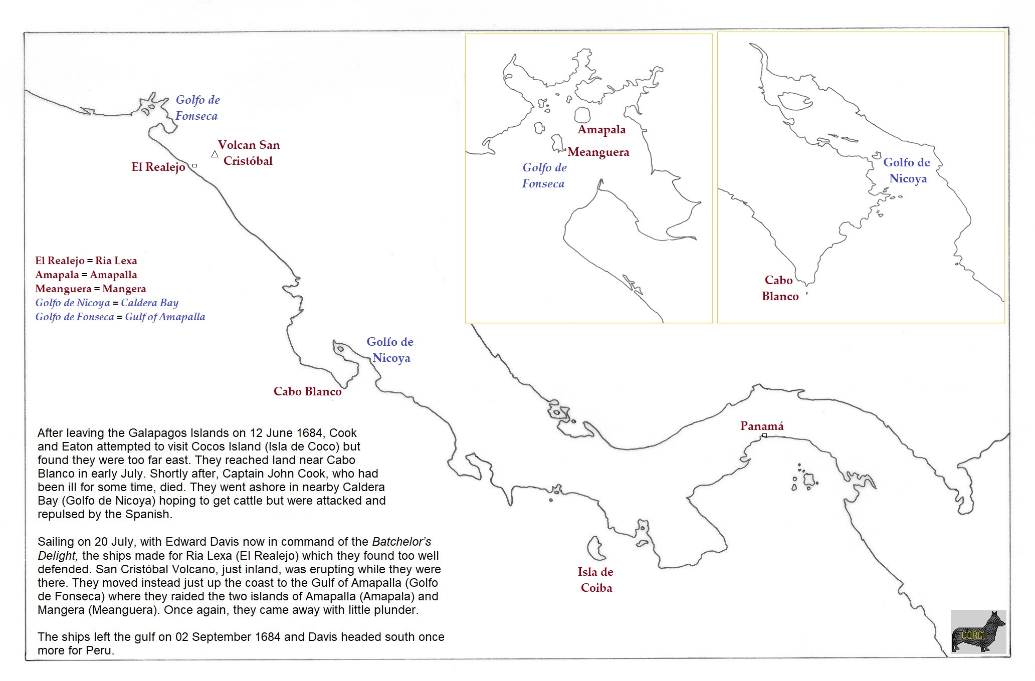a: Central American coast; b: Golfo de Fonseca; c: Golfo de Nicoya