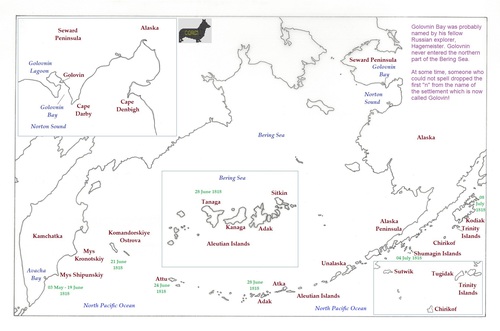 a: Kamchatka via Aleutians to Kodiak Island; b: Adak and neighbours; c: Chirikof and Trinity Islands; d: Golovnin Bay