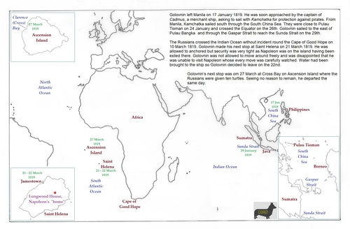 a: Manila to Ascencion Island; b: Gaspar and Sunda Straits; c: Saint Helena; d: Ascencion Island