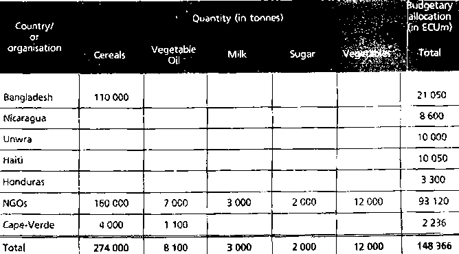 Sudan: ECU 2.5 million for the purchase and distribution of maize in a transit camp close to the capital (154 000 people) and in the south of the country (1 million people), and for the distribution of sorghum to Ethiopian and Eritrean refugees in the east (200 000 people).